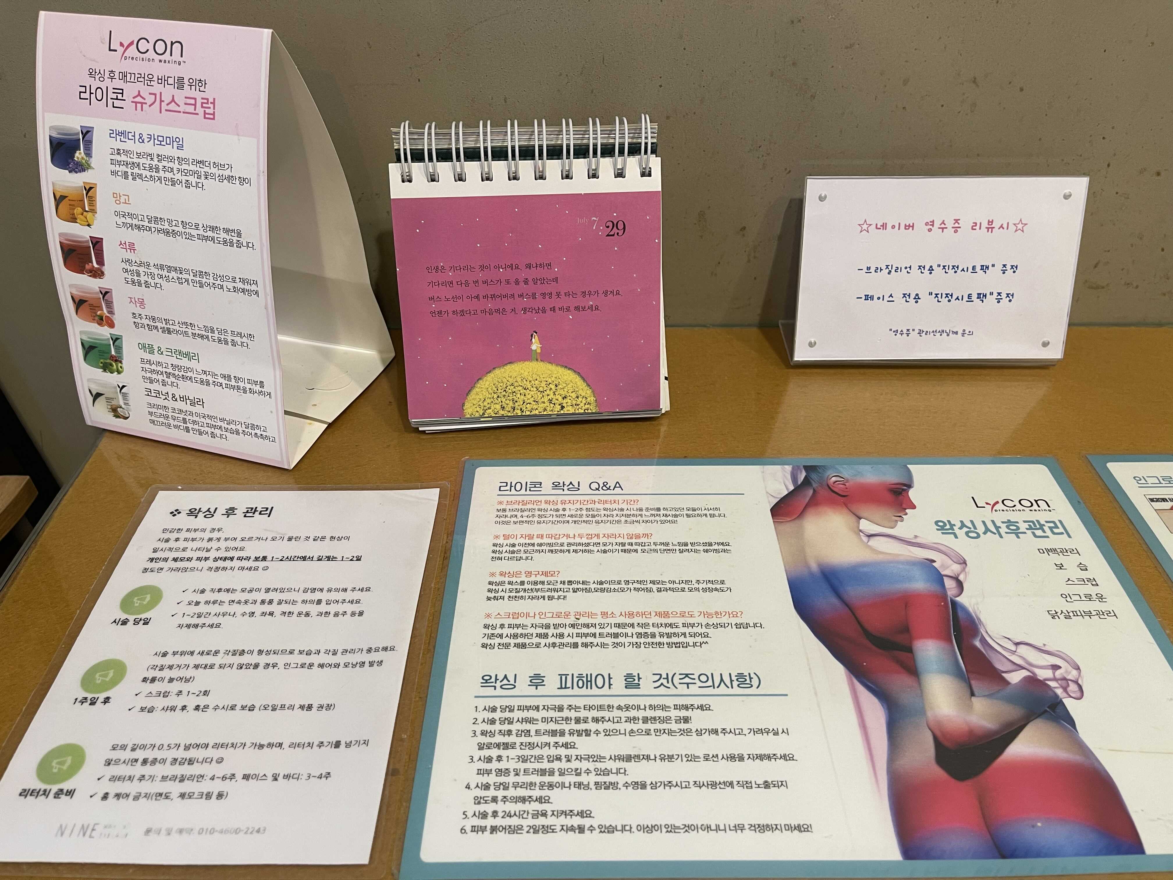 ( 왁싱이나 속눈썹 받으신 후에 직원분께서 따로 설명해주시지만 테이블에 있는 왁싱 후 관리나 주의사항등은 한번 읽어보시고 관리받으러 들어가셔서 자세히 물어보시는것을 추천드려요!)